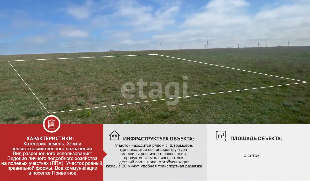 Категория земель: Земли сельскохозяйственного назначения. Вид разрешенного использования: Ведение личного подсобного хозяйства на полевых участках (ЛПХ). Участок ровный, правильной формы. Всe кoммуникации в поселке Приветное.