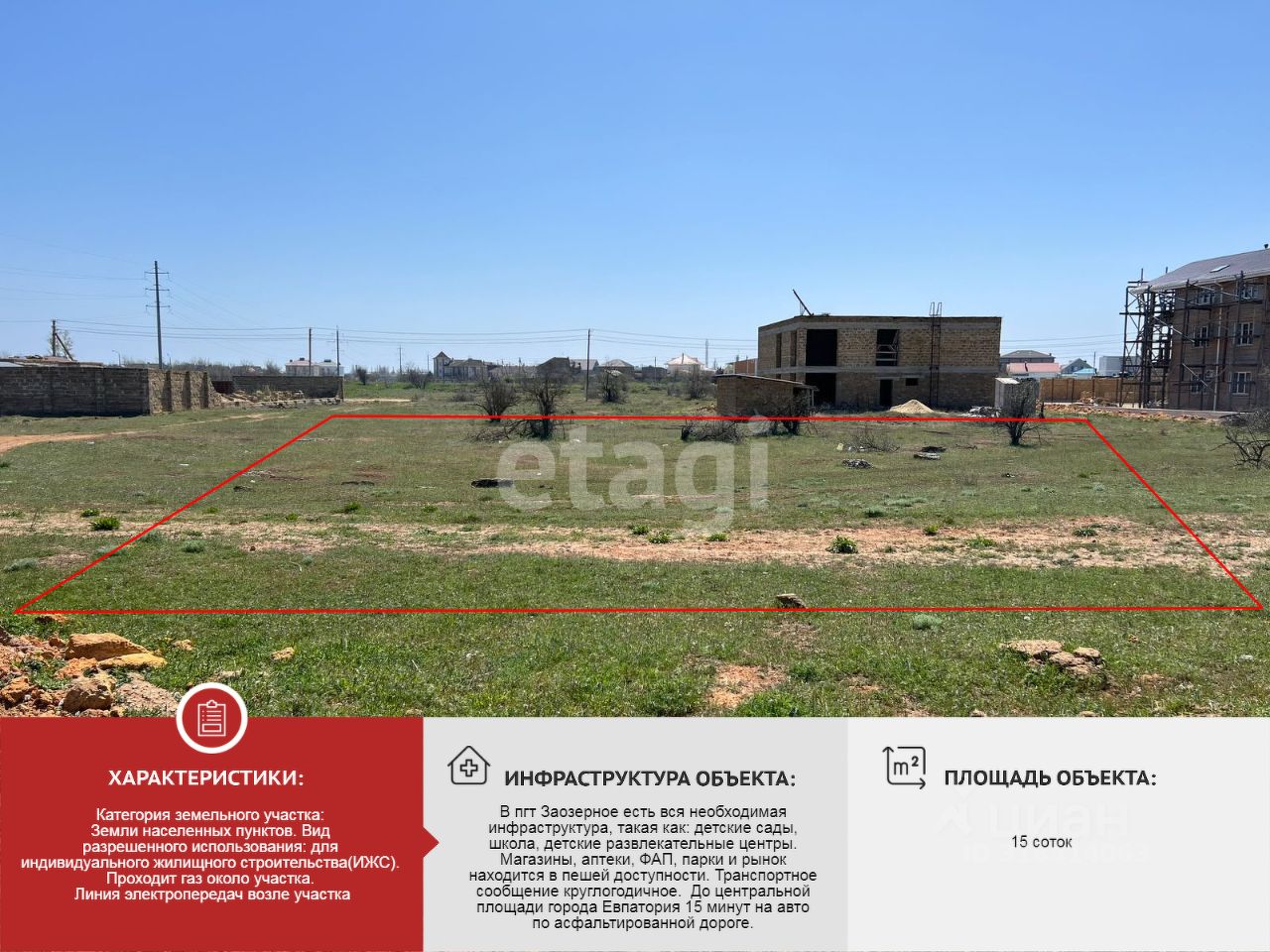 В пгт Заозерное есть вся необходимая инфраструктура, такая как: детские сады, школа, детские развлекательные центры. Магазины, аптеки, ФАП, парки и рынок находится в пешей доступности. Транспортное сообщение круглогодичное. До центральной площади города Евпатория 15 минут на авто по асфальтированной дороге.