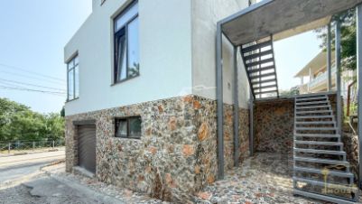 Конструкция включает два полноценных этажа и цокольный уровень. Здание расположено на склоне с удобным подъездом, оборудовано гаражом и дополнительным выделенным парковочным местом на участке.