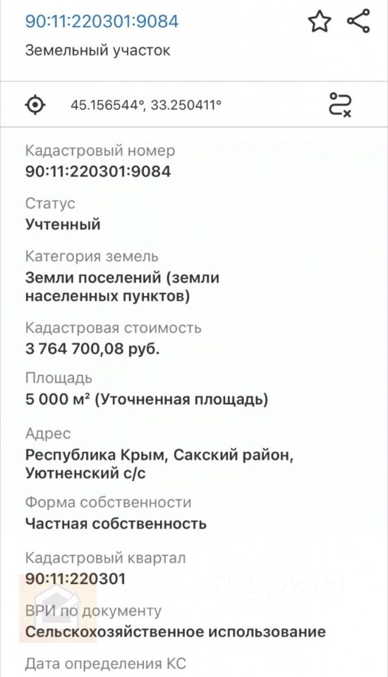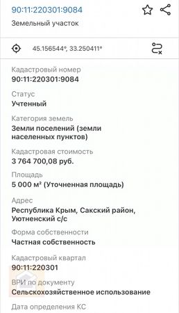 Земельный участок имеет кадастровый номер 90:11:220301:9084