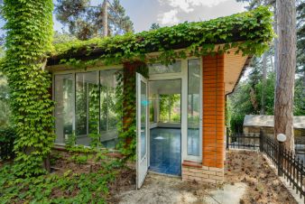 На ровном участке расположены: открытый бассейн, площадка для беседки, двухэтажное строение (90м2)  первый этаж  гараж с автоматическими воротами, второй этаж  зимний сад.