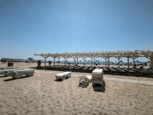 До моря - 1 км , ближайший пляж "Аква", рядом с Эволюцией.
