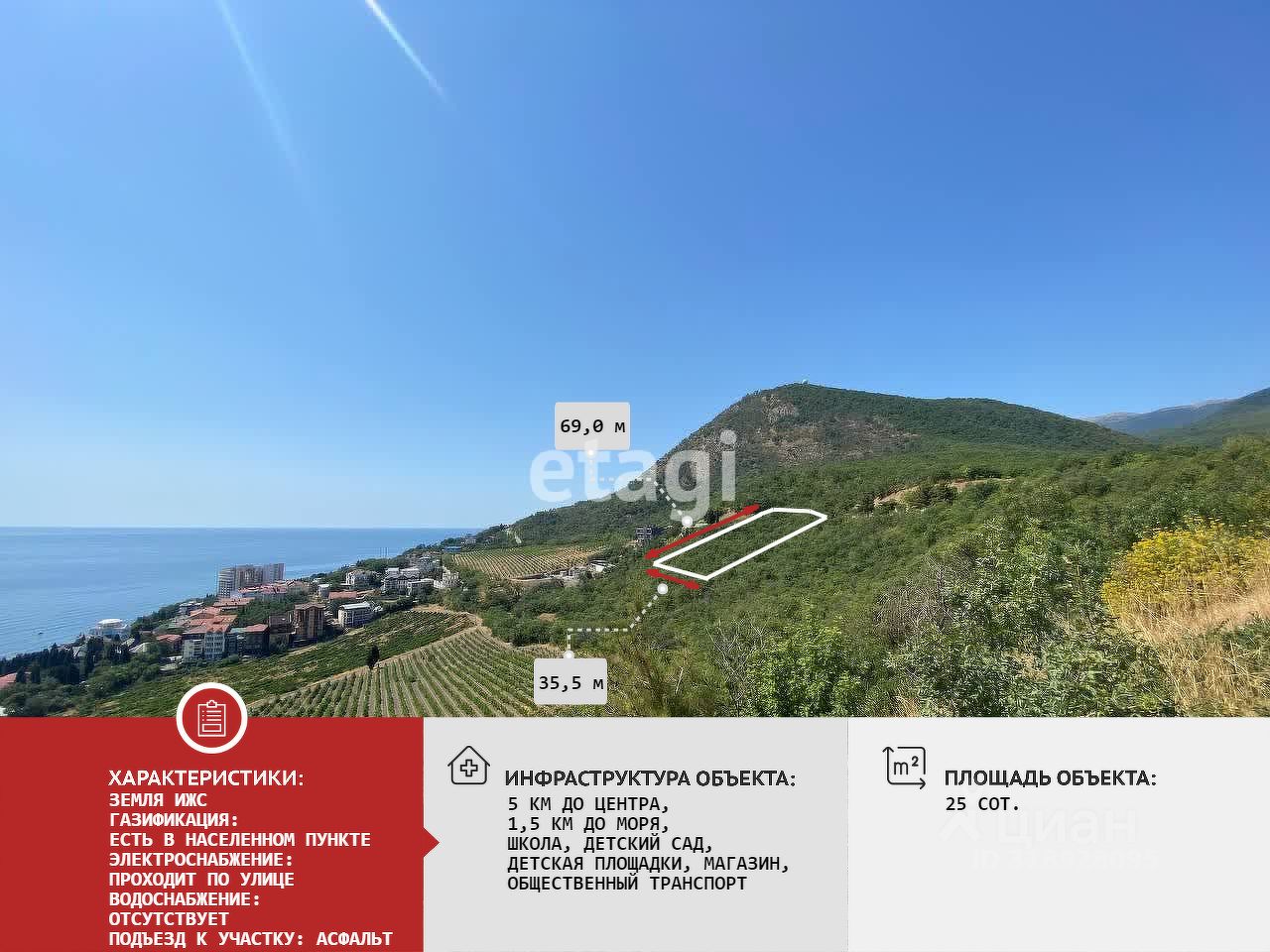 Участок ИЖС, 25 соток, правильной формы, находиться на возвышенности в активно застраивающемся районе с шикарными видами на море и горы.
