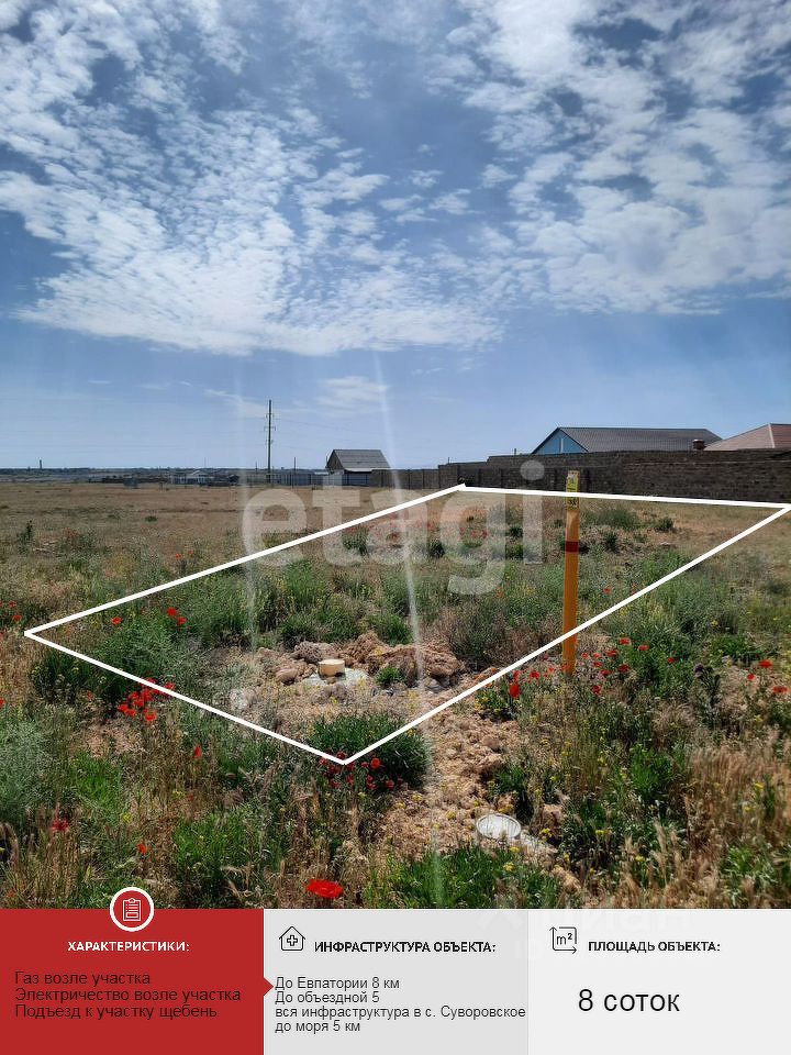 Продается земельный участок ИЖС, 8,35 соток, в Крыму, Сакский район, с.Суворовское. До города Евпатории 5 минут на машине.