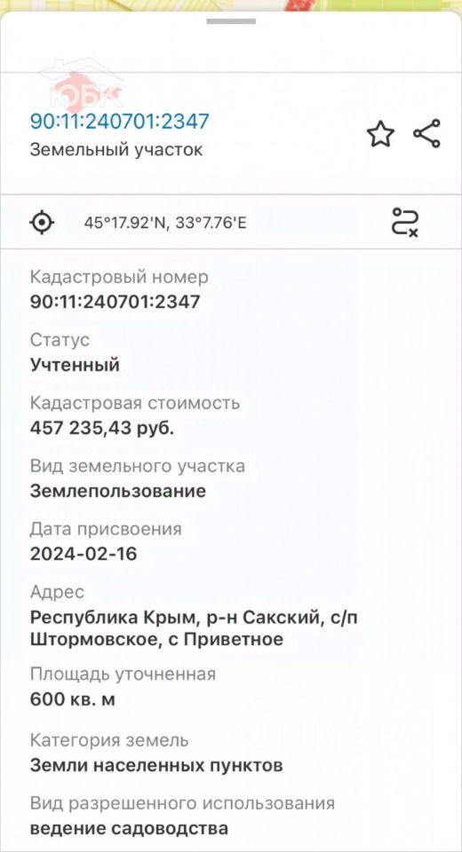 Участок выдан участнику СВО, который расположен в 6,5 км от береговой линии. В ближайшее время будут подведены все коммуникации, в связи с чем, стоимость участка возрастет. Участок имеет правильную форму, все документы РФ на руках, готовые к сделке. Торг уместен.