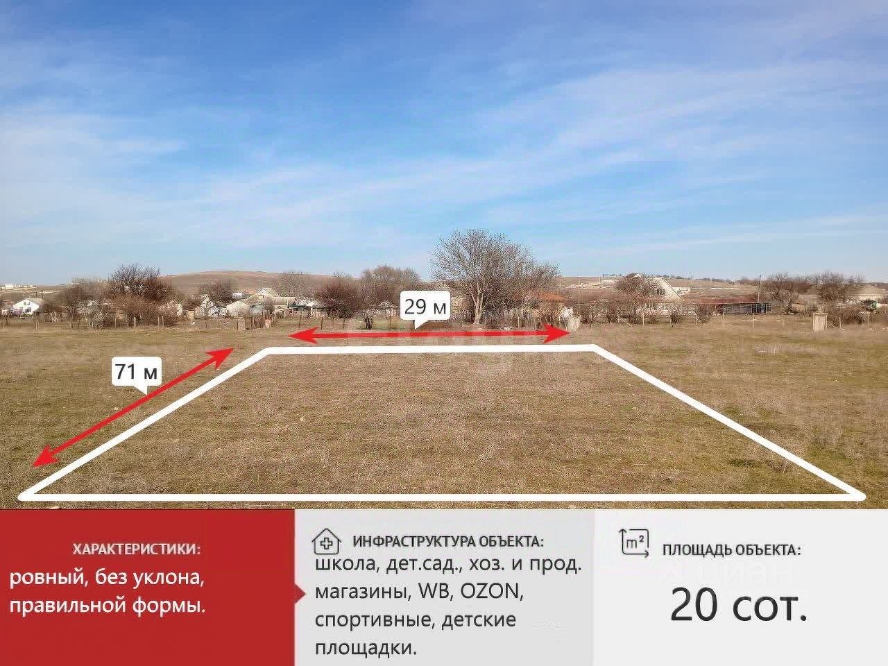 Участок ровный в новой развивающейся нарезке. Инфраструктура с. Урожайное хорошо развита - действующая школа и детский сад, ФАБ, церковь, мечеть, разнопрофильные магазины, автобусы до города ходят каждые 15 минут.