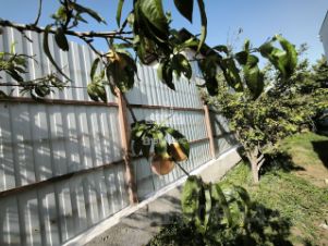 **Каменный забор** с откатными воротами (удобный заезд, не выходя из машины).