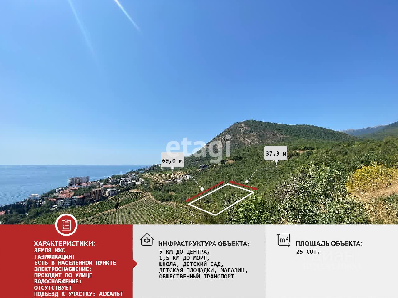 Участок ИЖС, 25 сот., правильной формы, находится на возвышенности в активно застраивающемся районе с шикарными видами на море и горы.