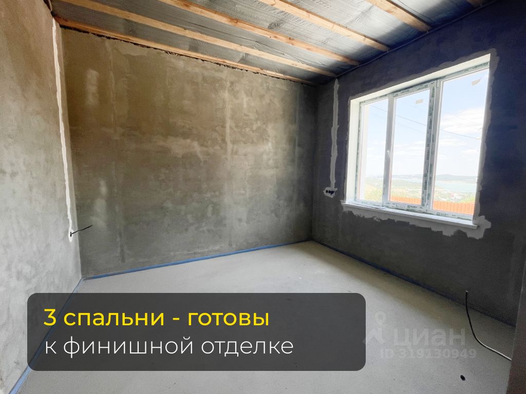 Дом уже с разводкой электрики, гипсовой штукатуркой и полусухой стяжкой. Монолитная площадка перед входом, мощная отмостка, забор по периметру.