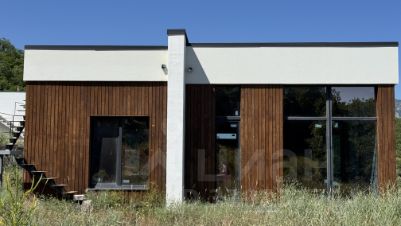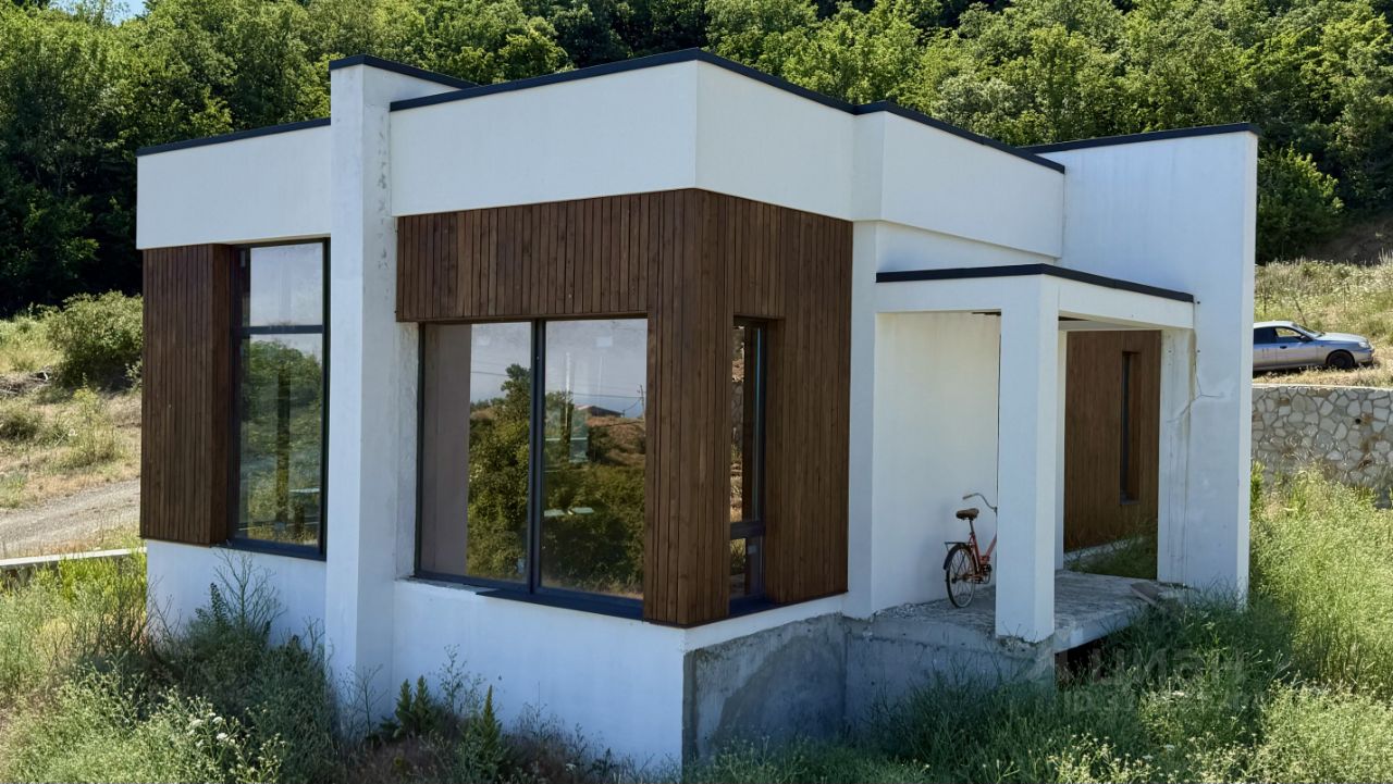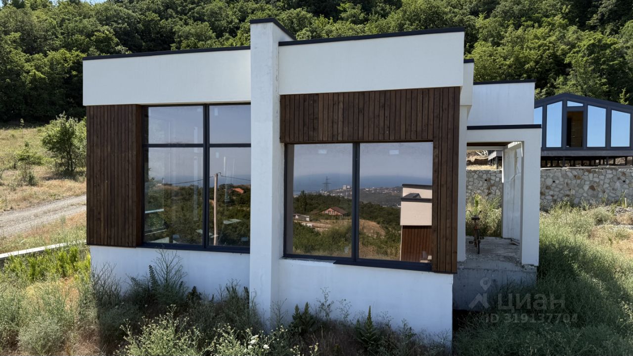 Дом свободной планировки, с панорамным остеклением. Смонтирована наружная лестница для подъема на кровлю, откуда открывается панорамный вид на горы и море.