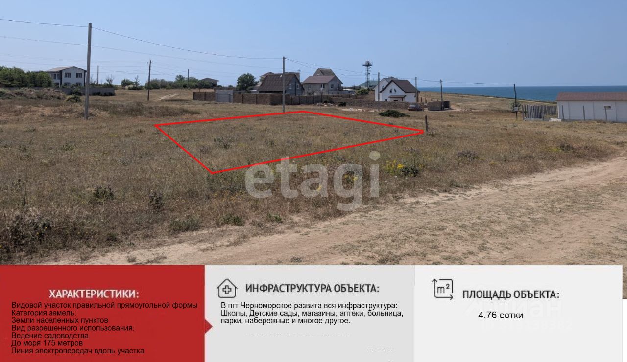 Участок ровный, правильной прямоугольной формы, не огорожен по периметру. Категория земли: Земли населенных пунктов. Вид разрешенного использования: Ведение садоводства. Электричество проходит вдоль участка. Для воды нужно бурить cкважину около тридцати метров.