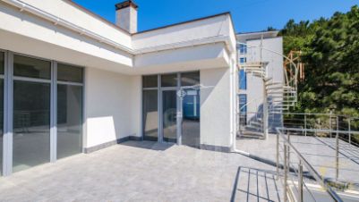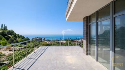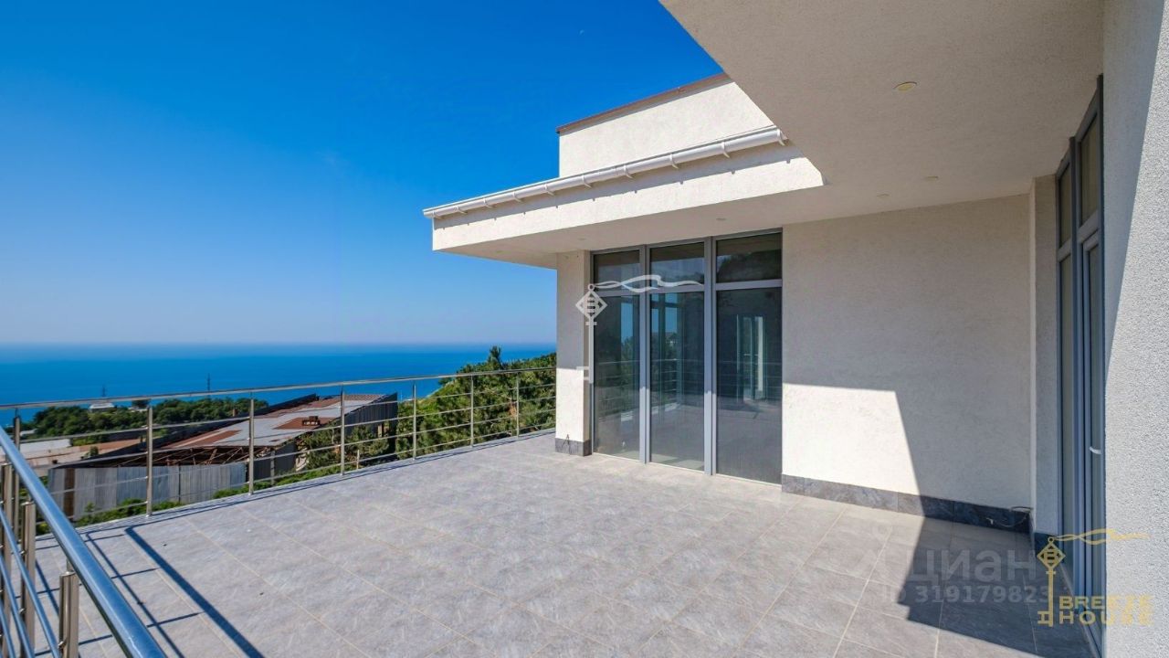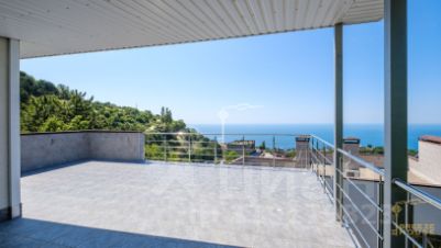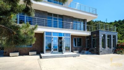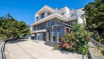 Продается новая 3-уровневая вилла площадью 300 м² в стиле хай-тек с панорамным видом на море и баней на участке 10 соток, расположенная в курортном поселке Гаспра, в 10 минутах езды от Ялты и побережья.