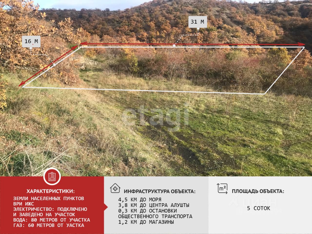 Прекрасная возможность для тех, кто мечтает о жизни в Крыму! Продается уникальный земельный участок площадью 5 соток, идеально ровной прямоугольной формы. Это ваш шанс создать собственный уголок рая, где каждое утро будет начинаться с восхитительных видов и свежего горного воздуха!