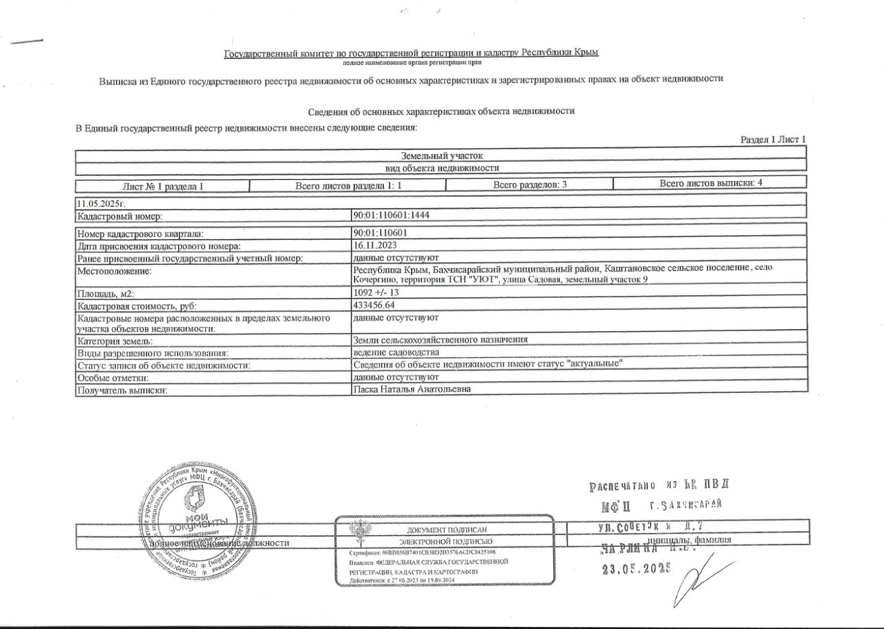 Продам участок в СНТ (точный адрес место-расположения: Респ. Крым, Бахчисарайский муниципальный р-он, Каштановское с/п, с. Кочергино, территория ТСН "УЮТ", ул. Садовая, з/у 9).