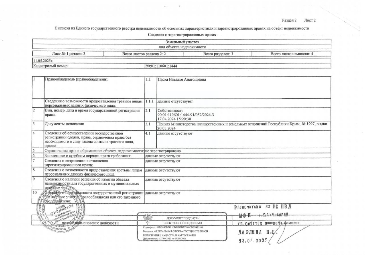 5. Участок поставлен на кад.учёт (90:01:110601:1444): определена кадастр.стоимость, проведено межевание (границы участка установлены и вынесены в натуру в соотв. с действующим законодательством).