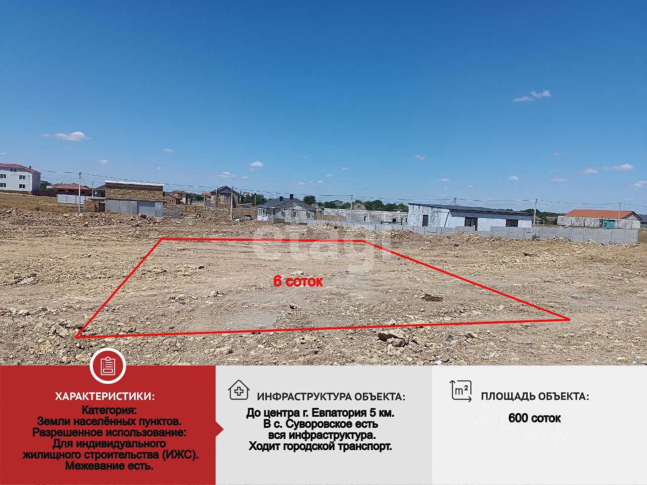 Село Суворовское пригород города Евпатории в северной его части. Ходит городской транспорт. Своя развитая инфраструктура: средняя школа, детский сад, амбулатория, аптеки, магазины, пункты выдачи, ДК. Участок подходит для строительства частного дома или дачи с перспективой круглогодичного проживания. Благодаря близости к трассе и общественному транспорту поездки в город занимают минимум времени. Отсутствие сложного рельефа и готовые коммуникации упрощают процесс застройки. Село отличается спокойной атмосферой, при этом все необходимые услуги доступны в пределах населенного пункта.