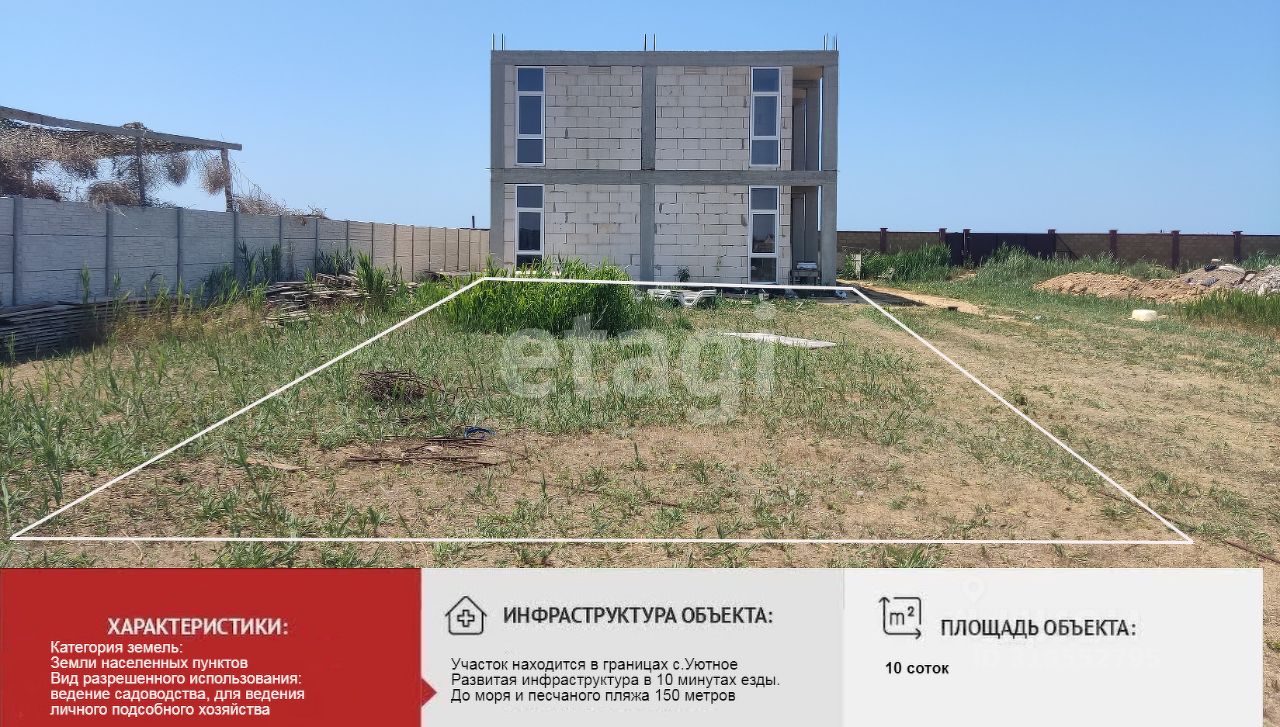 Участок расположен в перспективно развивающемся районе с. Уютное, идет активная застройка  имеются соседи. Земельный участок ровный. Заезд на участок возможен с двух сторон, проведено межевание.
