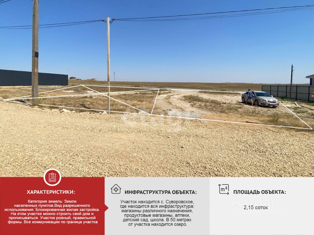 Участок находится с. Суворовское, где находится вся инфраструктура: магазины различного назначения, продуктовые магазины, аптеки, детский сад, школа. В 50 метрах от участка находится озеро.