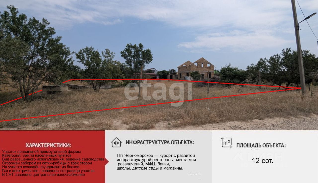 Активно застраивающийся район, есть уличное освещение. В СНТ круглогодичное проживание. можно прописаться. В шаговой доступности магазин, остановка. уютный благоустроенный пляж. В пгт Черноморское отлично развита инфраструктура: есть рестораны, места для развлечений, МФЦ, банки, школы, детсады, магазины.