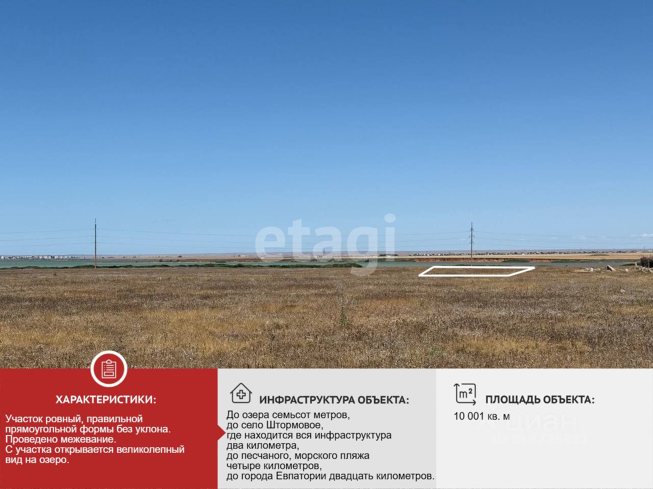 К участку есть подъездная дорога, в пяти минутах трасса "Таврида". Участок ровный, правильной прямоугольной формы без уклона. Проведено межевание. . С участка открывается великолепный вид на озеро, что добавляет особую привлекательность этому месту.