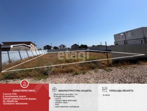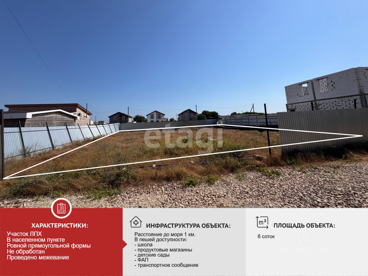 Продается участок площадью 6 соток расположен в Молочненском сельском поселении, в 1,7 км от песчаного побережья Чёрного моря и в 800 метрах от озера Солёное.