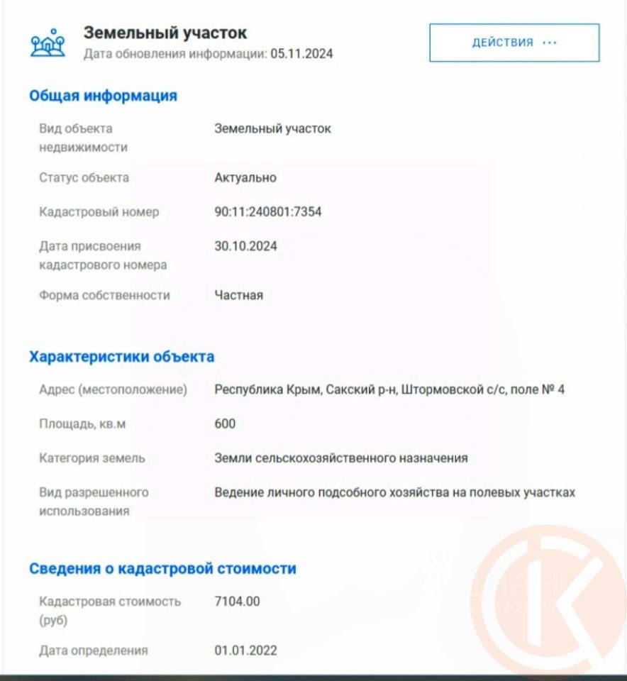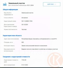 При звонке сообщите нам, пожалуйста, номер 545823 Продается участок 6 соток ЛПХ, находится между Штормовым и с. Хуторок, Штормовское с/с, поле 4.