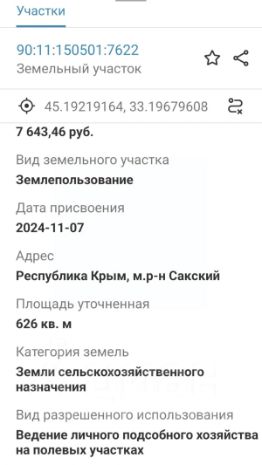 Продаётся участок 6,26 соток ЛПХ в с. Молочное!Участок находится возле асфальтированной дороги, электричество по границе участка, есть возможность подключить. До жилого массива — всего 1 км.Преимущества участка:Прекрасное расположение: до лечебного лимана — 80 м, до моря и песчаных пляжей — 1 км!Разрешённое использование: ведение личного подсобного хозяйства на полевых участках.Размер участка: 30 на 20 метров, угловой, два фасада!Это шикарное предложение для инвестиций! Документы готовы, межевание сделано.Не упустите свой шанс приобрести участок мечты!`