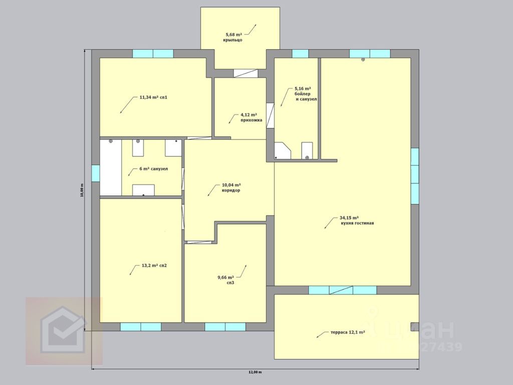 3 комнаты, Кухня-гостиная, Санузел, Бойлерная, Коридор, Прихожая