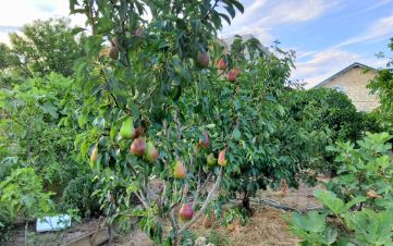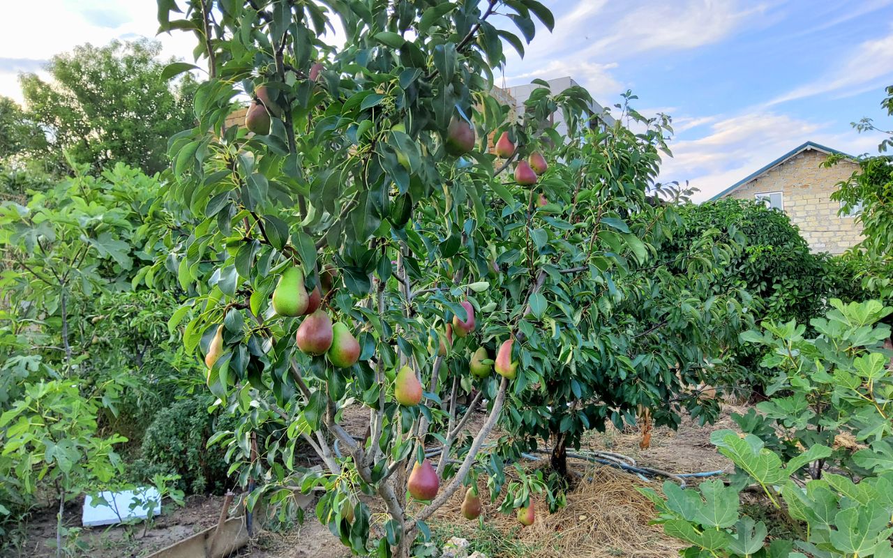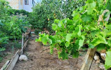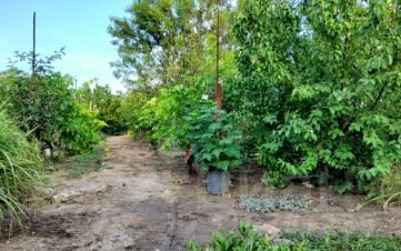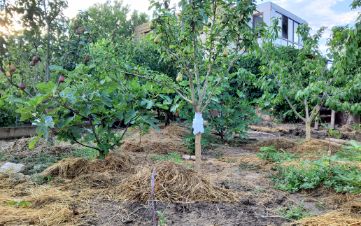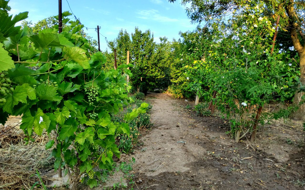 Участок ухожен, на нём растут плодовые деревья (персики, сливы, инжир, кизил), цветы и декоративные растения, создающие настоящий садовый оазис.