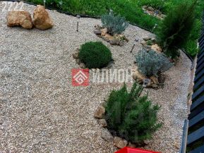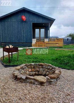 На участке создана ухоженная зона отдыха: дорожки, клумбы с цветами, плодовые насаждения, парковка для автомобиля. Участок огорожен забором на металлокаркасе. Забор и территория освещаются — установлены уличные фонари, подсветка забора и парковки, а также встроенный фоновый свет под крышей дома.