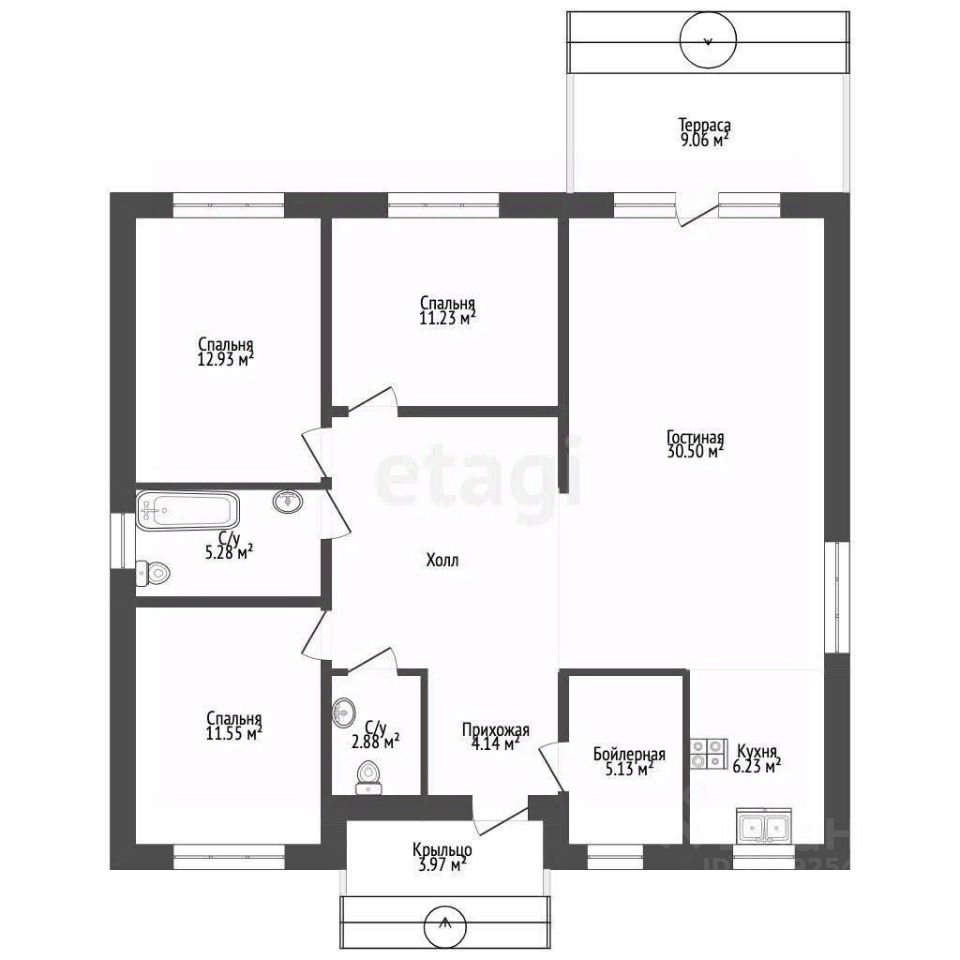 • 3 раздельные спальни 12,5кв.м, 16,6кв., 16,8кв.м, просторная кухня-гостинная -36кв.м, санузел- 4,4кв.м бойлерная-5кв.м, прихожая- 12,9кв.м, 1 терраса- 10кв.м .