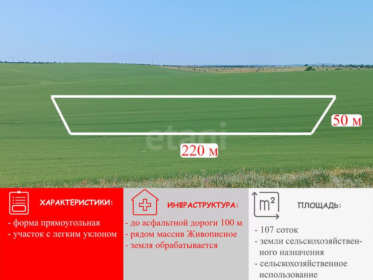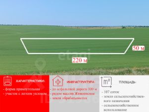 Земля сельскохозяйственного назначения, ведение личного подсобного хозяйства на полевых участках. 1,07 га. Ровный, прямоугольной формы. Плодородный грунт.