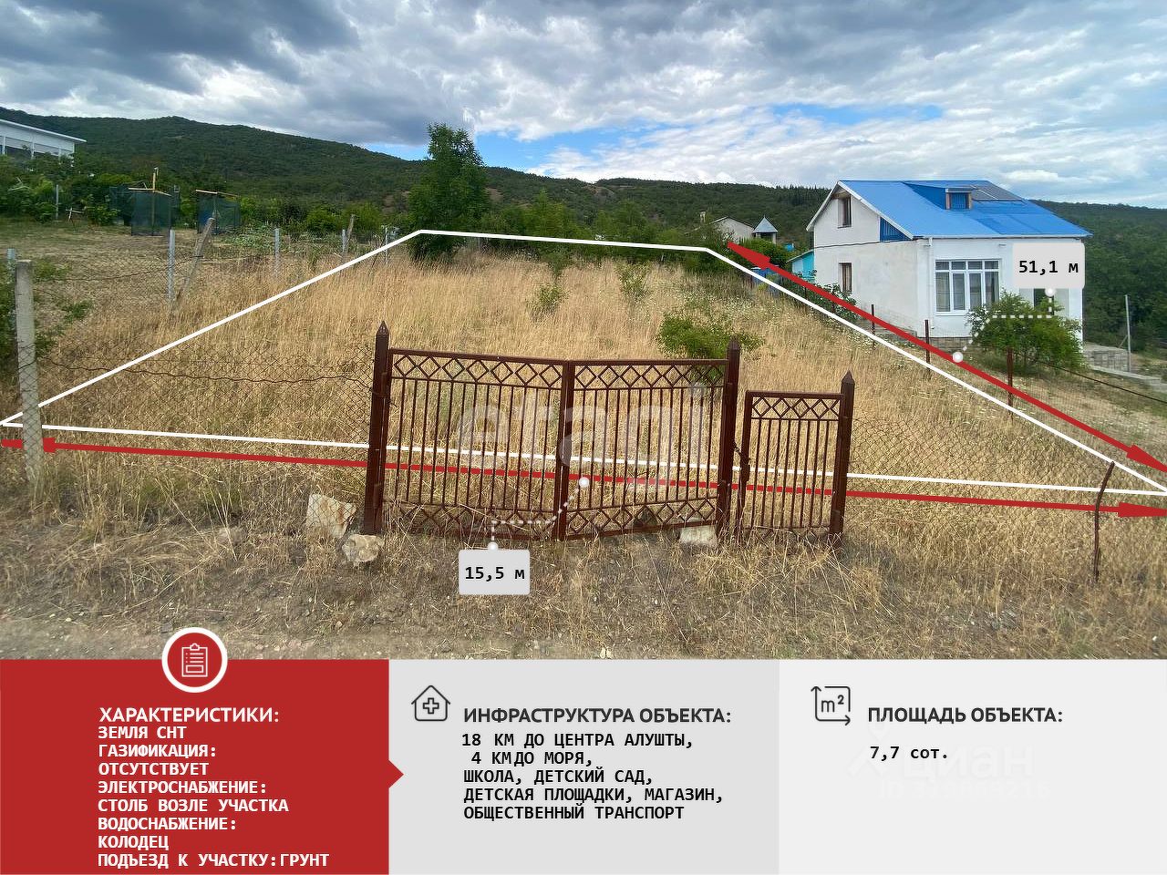 Участок площадью 7,74 соток расположен в селе Лучистое (СНТ "Победа") в 20 км от Алушты. Территория ровная, с подведенными коммуникациями — электричеством и водой. Место отличается тишиной и живописным горным окружением, при этом остается удобным для регулярных поездок благодаря новой асфальтированной дороге, ведущей от Алушты. В непосредственной близости находятся природные достопримечательности: гейзерные водопады и каменные грибы, что делает участок привлекательным как для строительства частного дома, так и для туристического бизнеса.