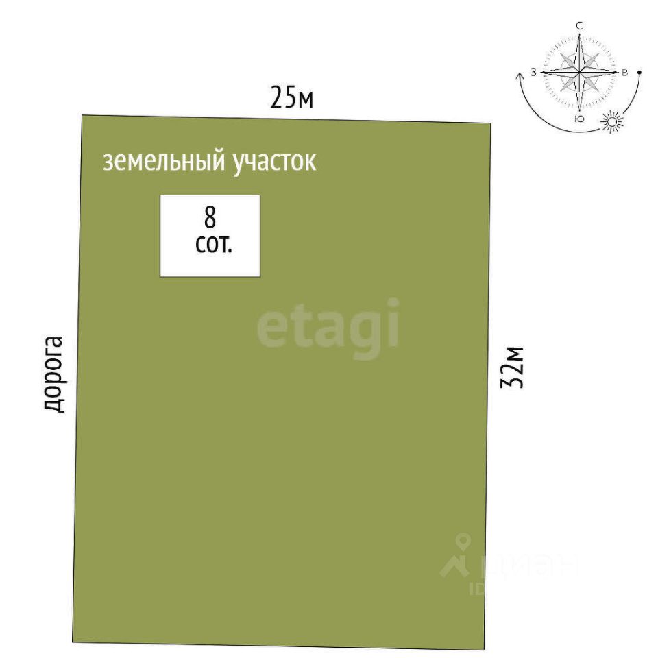Площадь участка 8 соток, предназначен для индивидуального жилищного строительства.
