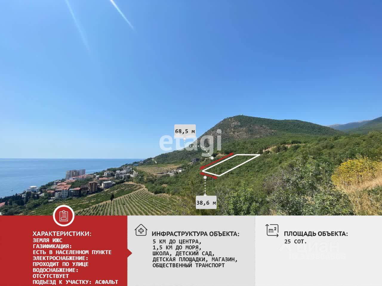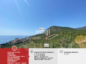 Участок ИЖС, 25 соток, правильной формы, находиться на возвышенности в активно застраивающемся районе с шикарными видами на море и горы.