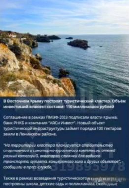 СОБСТВЕННИК! Продается на берегу Азовского моря видовой на море земельный участок лпх самой большой площадью 9.1 сот. 800 м от моря, 10 мин. ходьбы. Для инвестиции, дальнейшего роста цен или для себя. Документы все оформлены! Земля плодородная, чернозем, можно построить не капитальный дом, дачу (на фото пример как можно построить). На побережье идёт активная стройка нового города, отелей, гостевых домов, аквапарка и других объектов в рамках подписанных соглашений о развитии курортов Крыма, Стратегии развития курортов Приазовья. Широкие песчаные пляжи длиной 100 км, чистое море, рыбалка (пеленгас, судак, др.). В селе находится Арабатская крепость. В 4 км от села находится грязелечебное солёное озеро Сиваш, летом розовое (лечение кожных, опорно-двигательных болезней, др.), до Черного моря пгт.Приморский, г.Феодосия 30 мин.езды. Возможно дистанционное оформление через Сбербанк (безрисковая сделка, оплата покупки участка после регистрации перехода права собственности на имя покупателя). Если не дозвонились, пишите сообщения. ОПИСАНИЕ И ФОТО ПОЛНОСТЬЮ СООТВЕТСВУЮТ ДЕЙСТВИТЕЛЬНОСТИ!