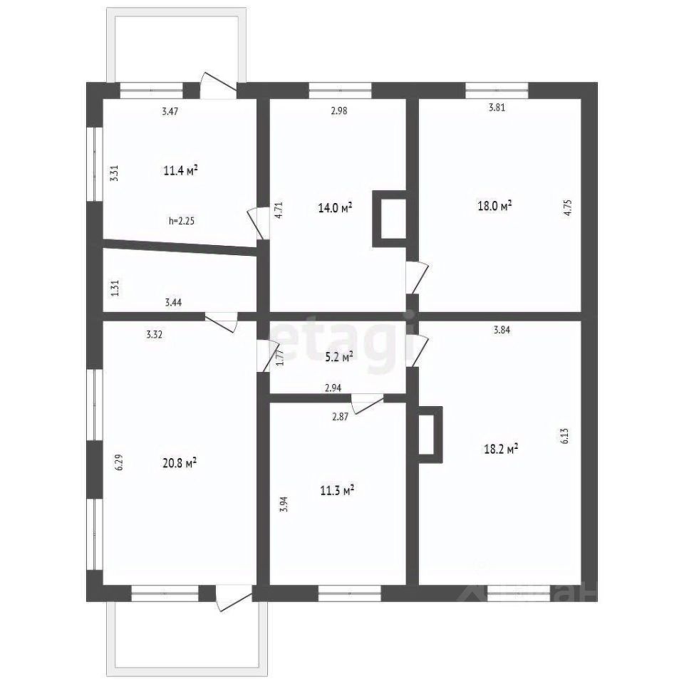 Общая площадь дома составляет 143,5 квадратных метра. В доме есть прихожая, три спальни, зал, кухня и гараж на цокольном этаже.
