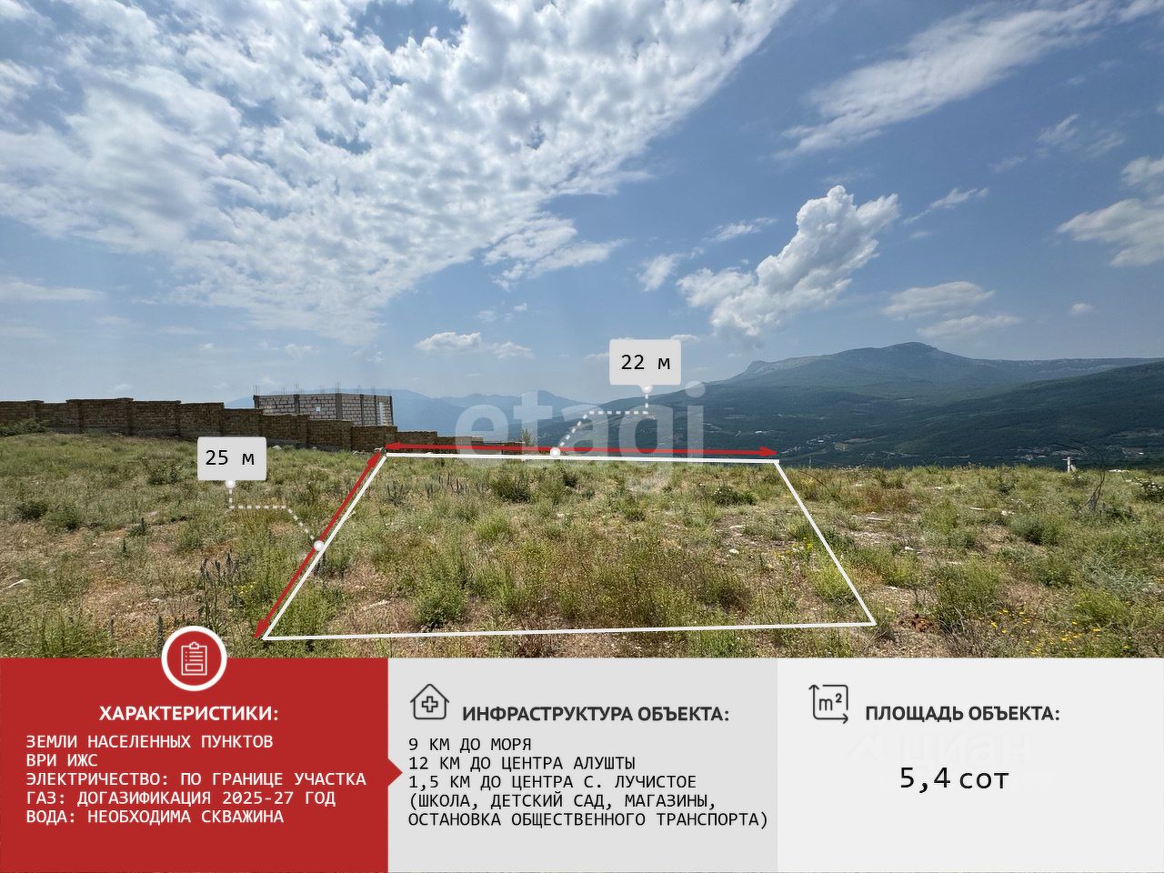 Площадь земельного участка 5,4 соток. Отличная локация для строительства жилого дома и постоянного проживания. Удобный подъезд прямо к участку. Лечебный горный воздух. Чистейшая питьевая вода из источников горы Демерджи.