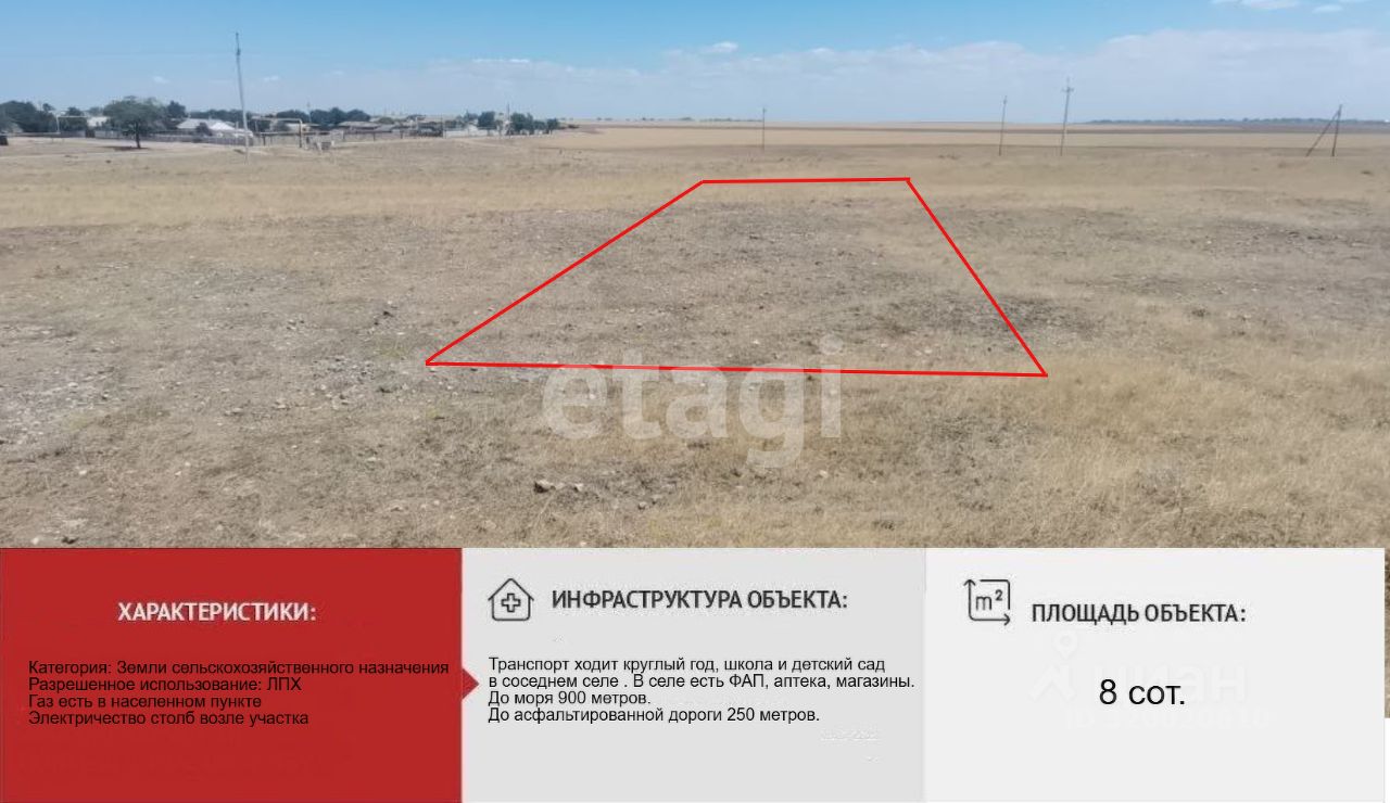 Земельный участок имеет вид разрешенного использования: Земли сельскохозяйственного назначения, ведение личного подсобного хозяйства . Участок ровный не огорожен прямоугольной формы 20 на 40 м. Очень хорошее месторасположение. В 250 метрах от участка асфальтированная дорога, до морского побережья и прекрасных песчаных пляжей и чистейшего моря не более 1 км.
