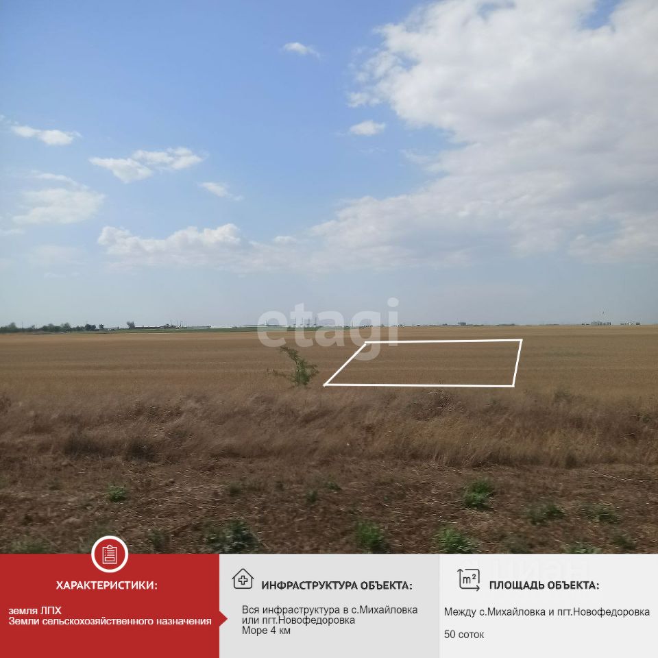Земельный участок площадью 50 соток (ЛПХ) расположен в Сакском районе Западного Крыма, на первой линии между поселками Новофедоровка и Михайловка. Участок ровный, оформлен в собственность, проведено межевание с уточнением границ. (Состоит из 5 участков по 10 соток).Главное преимущество — близость к Черноморскому побережью: до набережной всего 3 км, а до центра Новофедоровки — 800 метров. Поселок предлагает развитую инфраструктуру: школу, детский сад, храм, аптеки, магазины, а также благоустроенную набережную с кафе и зонами отдыха.