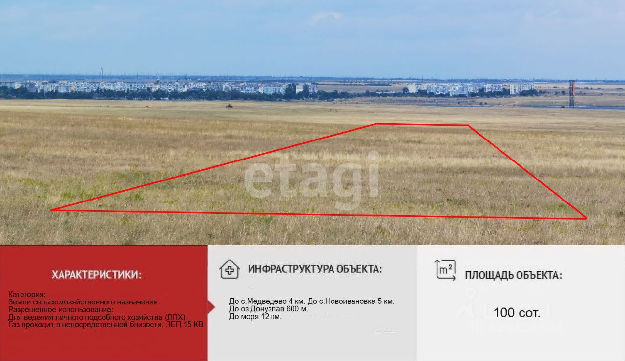 Продается уникальный земельный участок площадью 1 га, расположенный в живописном уголке Новоивановского сельского совета, всего в 600 метрах от великолепного озера Донузлав. Назначение земли — для личного подсобного хозяйства (ЛПХ), но согласно прогнозам, в ближайшие два года эти земли будут переведены в категорию рекреации, что значительно увеличит их стоимость. Это отличная возможность для тех, кто хочет вложить средства в перспективный объект!