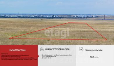 Природные достопримечательности включают озеро Донузлав с песчаными пляжами, устричными фермами и возможностями для водного отдыха, а также популярные локации — косу Беляус, пляж Майами для кайт-серфинга, мыс Тарханкут и парк "Экстрим-Крым" с регулярными фестивалями. Ближайшие населенные пункты — Медеведево и Новоивановка, расположенные менее чем в 4 км, предлагают все необходимые удобства: магазины, медицинские учреждения, школы и детские сады. Все документы готовы к продаже, и вы можете стать владельцем этого участка уже сегодня!