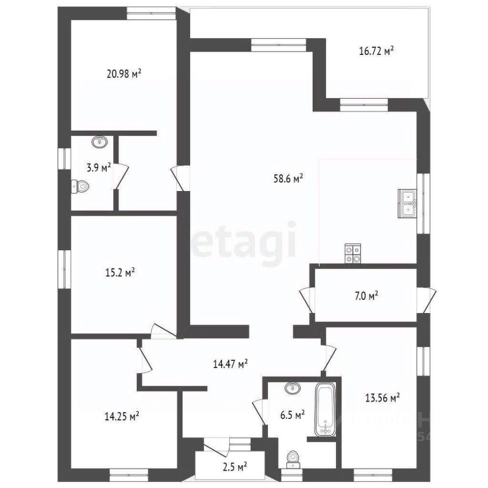Планировка включает четыре спальни, кухню-гостиную с высотой потолков 5 м и выходом на террасу, два санузла, гардеробную и котельную с отдельным входом. Дом спроектирован с учетом инсоляции — окна ориентированы для оптимального естественного освещения. Черновая отделка выполнена: гипсовая штукатурка, разведенные коммуникации, открыты лицевые счета на воду и электричество. Финишную отделку можно адаптировать под предпочтения будущего владельца.
