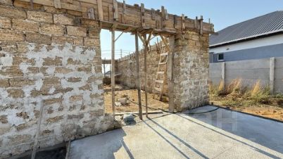 Дом утеплен, нанесена фактурная штукатурка короед, окрашен. Смонтирована водосточная система. По периметру дома широкие отмостки. Во дворе залита стяжка в зоне террасы и крыльца.