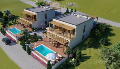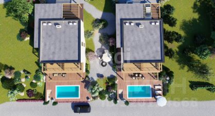 Дом по плану включает бассейн, а парковочная зона организована на уровне перекрытия второго этажа с усиленным армированием плиты. Конструкция позволяет достроить третий этаж или оформить кровлю в стиле шале, расширяя возможности для индивидуального дизайна. На участке уже подведены все необходимые коммуникации: электричество, газ, водоснабжение, канализация (септик для каждого дома). Использован бетон марки М300-350, что подтверждает высокое качество строительства.