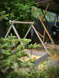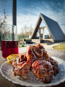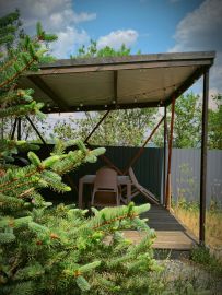 Находится в 5 минутах от трассы, в окружении леса с видом на долину. Забор из металлопрофиля, откатные ворота, высажены голубые ёлки и можжевельники. Установлена беседка с газовым грилем и мебелью.