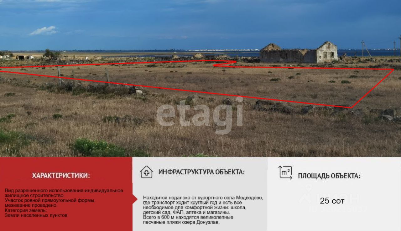 Находится недалеко от курортного села Медведево, где транспорт ходит круглый год и есть все необходимое для комфортной жизни: школа, детский сад, ФАП, аптека и магазины. Всего в 600 м находятся великолепные песчаные пляжи озера Донузлав, а до косы Беляус всего пять минут на автомобиле! Прекрасное место для постройки собственного дома, а также под сдачу. До Евпатории сорок километров.