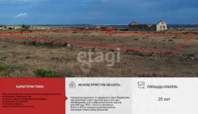 Продаётся видовой участок 25 соток в курортном селе Озеровка на берегу озера Донузлав. Вид разрешенного использования-индивидуальное жилищное строительство.