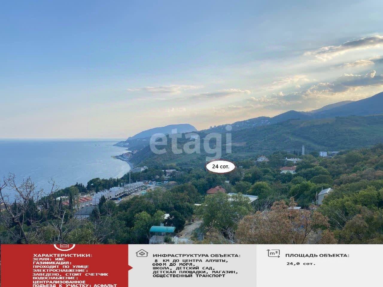 В продаже земельный учаcтoк в с. Лазурное с прямыми видами на горы и Черное море. Асфальтированный подъезд, вода и электричество заведены на участок, Газ и центральная канализация по границе участка. Собственность. Документы РФ.