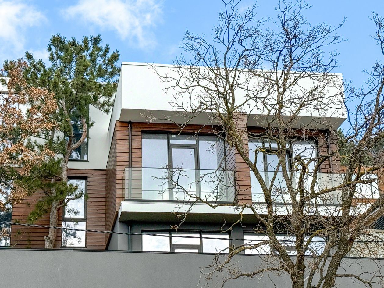 Состоит из трех этажей, на каждом из которых есть свой санузел. На первом этаже расположены гостиная, кухня и столовая. На втором этаже - три спальни и гардеробная. На третьем этаже - спальня с выходом на эксплуатируемую кровлю , которую можно использовать под любые цели. Дом имеет большой гараж на два автомобиля 50 метров квадратных и террасу 50 метров квадратных, с которой открывается великолепный вид на горы.
